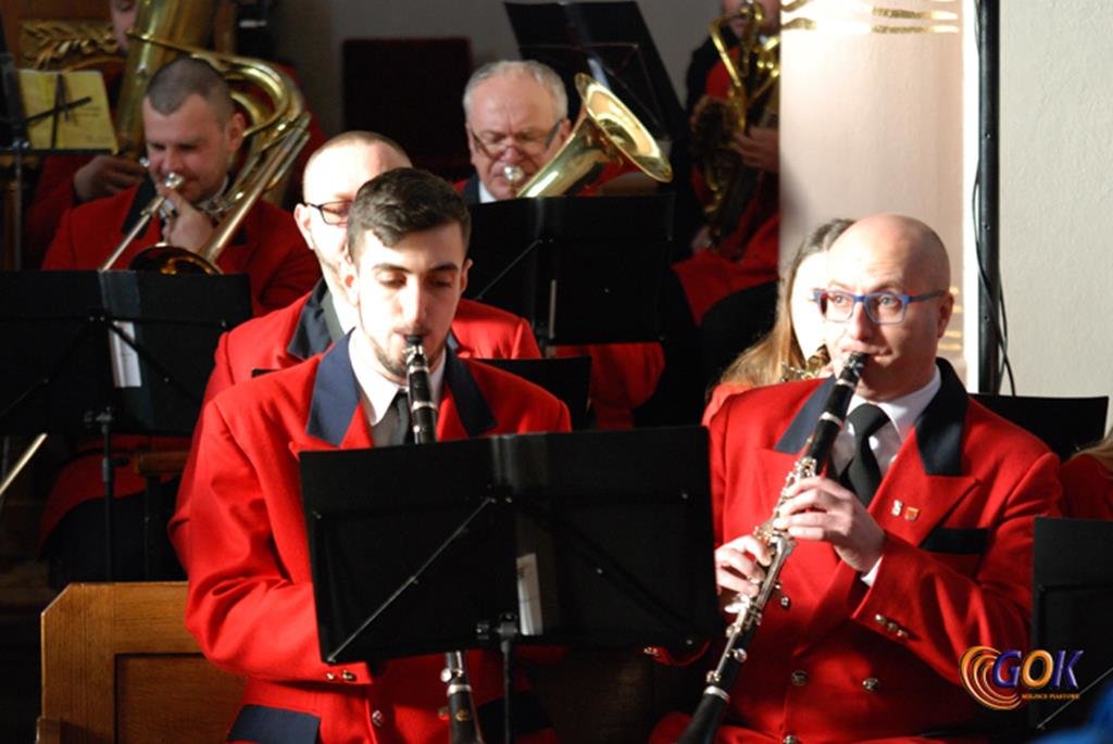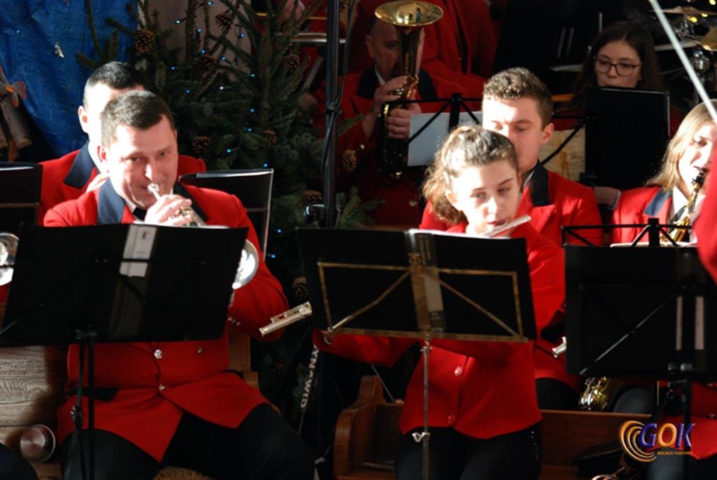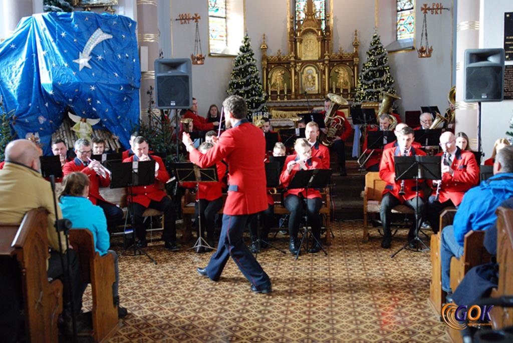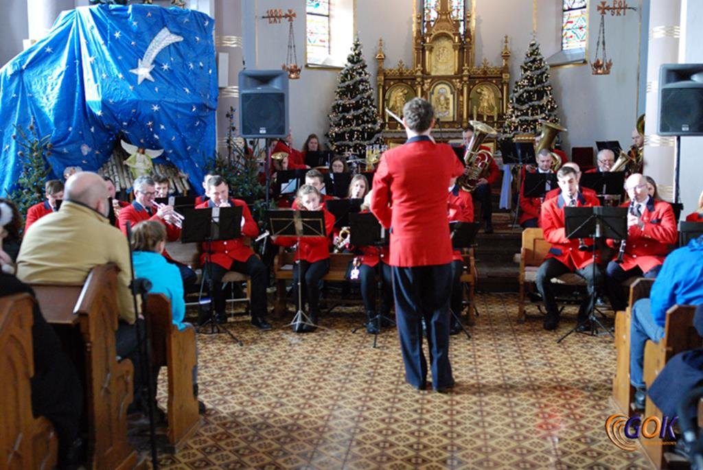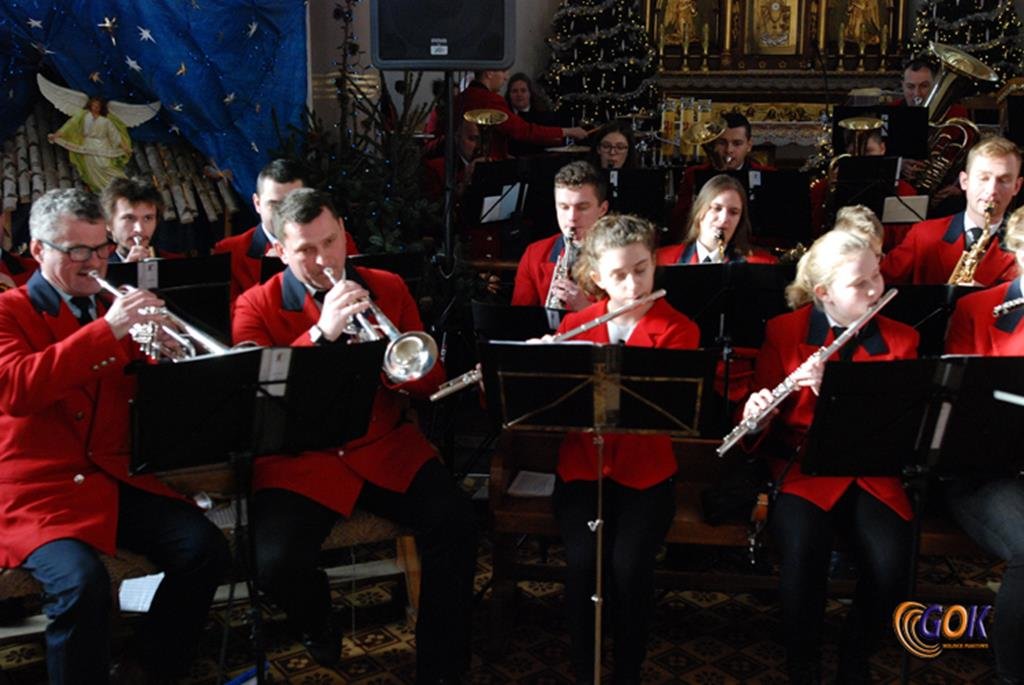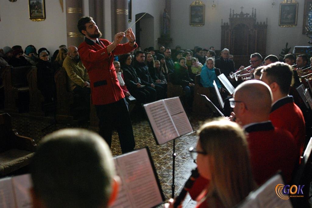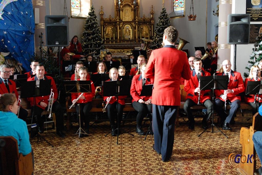 Po występie młodych artystów w świątyni donośnym echem rozbrzmiały dźwięki instrumentów dętych, pod batutą kapelmistrza Miłosza Markiewicza. Orkiestra wykonała kilka kolęd, a następnie przyszedł czas na utwory muzyki rozrywkowej i na zakończenie koncertu, jak na karnawał przystało, nie mogło zabraknąć wiązanki walców Johanna Straussa. Na końcu koncertu, życzenia Noworoczne w imieniu własnym i całej orkiestry złożył wszystkim Janusz Węgrzyn dyrektor GOK i zastępca wójta Magdalena Hec-Mrozek. Składamy serdeczne podziękowania proboszczowi parafii księdzu Andrzejowi Mroczkowskiemu za serdeczne przyjęcie naszych dęciaków.